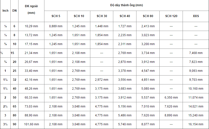 Độ dày thành ống (Schedule), đơn vị đo là mm là chỉ số thường được đính kèm cùng với DN để quy đổi kích thước ống một cách chính xác nhất. Độ dày thành ống được viết tắt trên bảng quy đổi là SCH hoặc SCHED. Tùy theo tiêu chuẩn khác nhau, SCH có độ dày khác nhau.