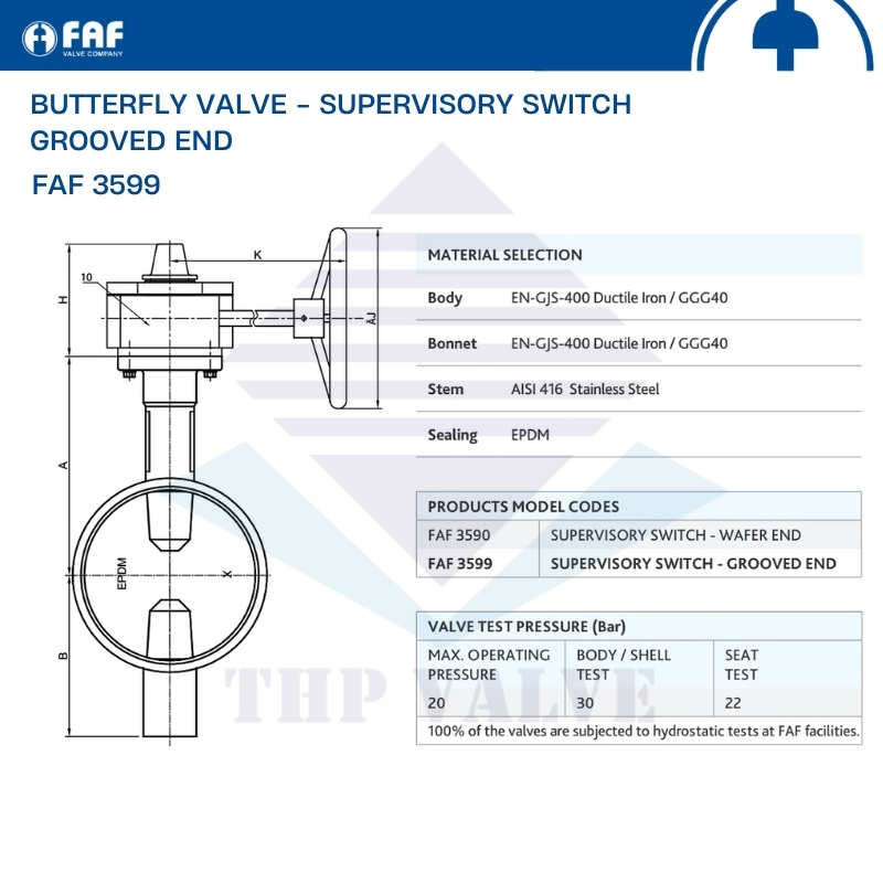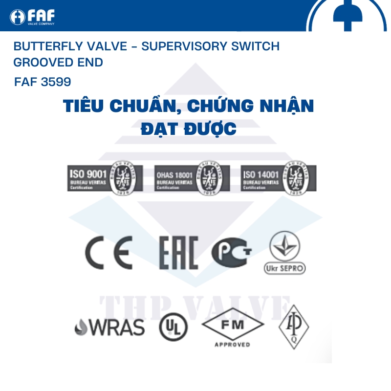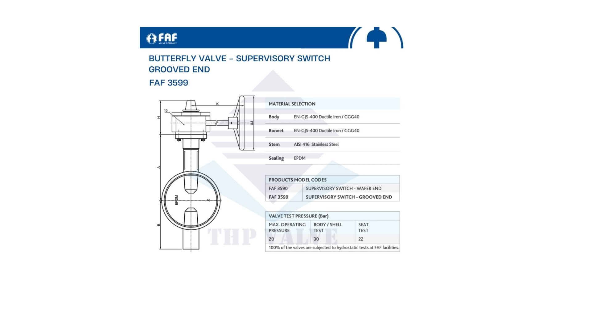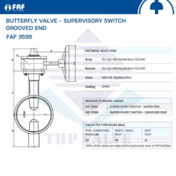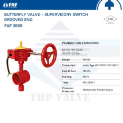 Van bướm FAF 3599 là dòng van bướm kèm công tắc giám sát do hãng FAF (Thổ Nhĩ Kỳ) sản xuất, thiết kế grooved end giúp kết nối nhanh chóng vào hệ thống đường ống rãnh tiêu chuẩn EN/ISO.