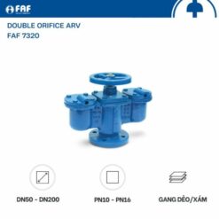 Van xả khí cầu đôi FAF 7320 DN65 là dòng van xả khí hai chức năng (double orifice air valve) cao cấp, chuyên dùng trong các hệ thống cấp nước sạch, xử lý nước thải, trạm bơm tăng áp và các tuyến ống công nghiệp. Với cơ chế cầu đôi, sản phẩm đảm bảo xả khí nhanh ở cả áp suất cao và thấp, đồng thời hút khí hiệu quả khi đường ống bị rỗng hoặc xả nước.